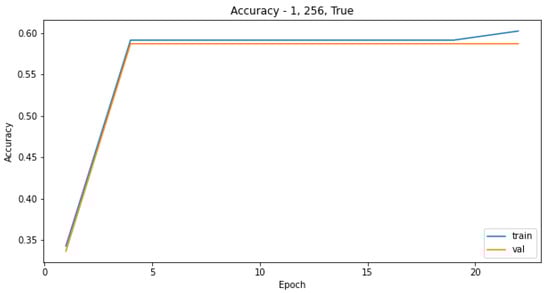 Model accuracy for the model with 1 layer and a batch size of 256 in relation to different number of epochs used to train the CNN.