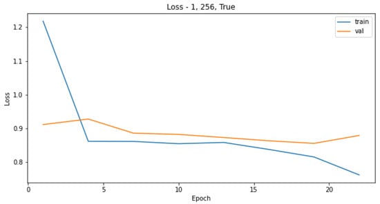 Model loss for the model with 1 layer and a batch size of 256 in relation to different number of epochs used to train the CNN.