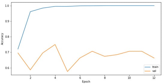 Model accuracy for the training and validation sets in relation to different number of epochs used to train the CNN.