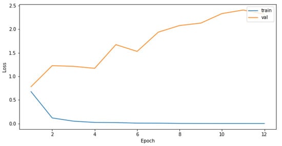 Model loss for the training and validation sets in relation to different number of epochs used to train the CNN.