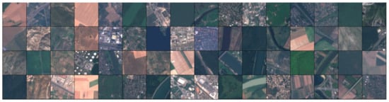 The EuroSAT dataset is considered a novel dataset based on the multispectral image data provided by the Sentinel-2 satellite. It has 13 spectral bands consisting of 27,000 labelled and georeferenced images (2000–3000 images per class) categorised into 10 different scene classes. The image patches contain 64 × 64 pixels with a spatial resolution of 10 m. Figure 1 demonstrates some sample images from the EuroSAT dataset [34].