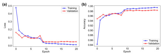 Figure 4 shows the training and validation loss and accuracy diagrams. It can be seen that in the first epoch, both the loss and accuracy improved exponentially and then showed a linear relation in epochs 2–10. During this period, some instability in learning was observed, and towards the end, no significant improvement was noticed. Since an adaptive learning rate with ReduceLROnPlateau was used, the learning rate was updated thrice during the training, which certainly helped the model to achieve the optimum result.