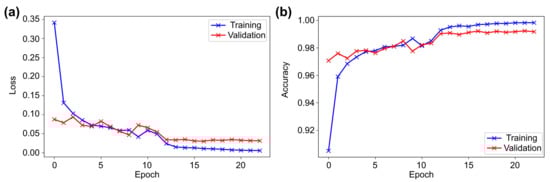 While training without data augmentation (WDA), a validation accuracy of 98.14% was achieved, whereas training with data augmentation resulted in a better accuracy of 98.55% (Table 2). The early stopping method was used with patience of 5, and the model with the highest validation accuracy was saved. This approach helped in preventing the overfitting of the model and saved computational time. Due to early stopping, the training stopped at the 21st epoch (18th—WDA); the total number of epochs was 25. It took 2 h, 4 min, 12 s to train 21 epochs, which means approximately 6.1 min for each epoch. However, without data augmentation, it took 1 h, 47 min, 24 s to train 18 epochs, which means approximately 5.9 min for each epoch (Table 2).