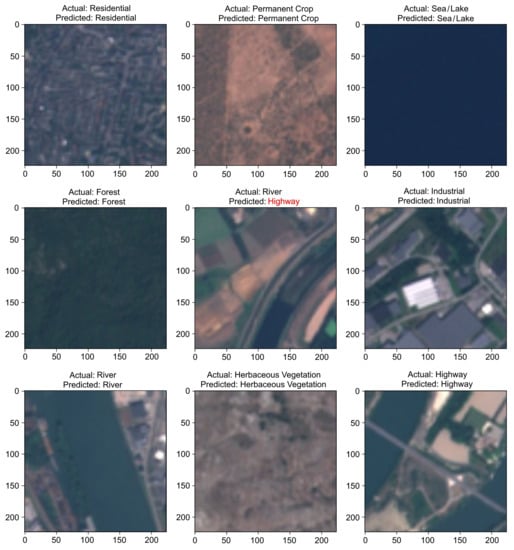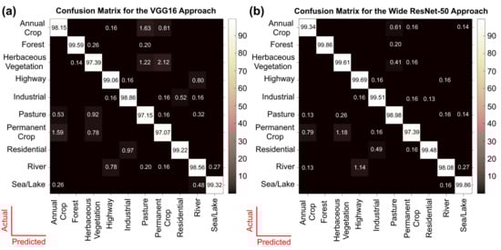 From the confusion matrix shown in Figure 6b, one can see that the Forest class, followed by the Sea/Lake class, was the best handled, as it was hardly misclassified. Similarly, due to similar topological features, Herbaceous Vegetation, Annual Crop, Pasture, and Permanent Crop classes were confused. The Highway class was misclassified as the River class because of a similar linear appearance. A similar trend was observed in the VGG16 confusion matrix (Figure 6a). The presence of clear and distinct topological features for the Forest and Sea/Lake classes, i.e., mostly green and blue for both the images, led to accurate results. Similarly, Pasture, Herbaceous Vegetation, and Annual Crops were misclassified to higher degrees. Again, the Highway and River classifications were also confused because of similar topological features. Thus, from these trends, it was concluded that the model’s training was mimicking human learning patterns. With the presence of more inter and intra-class variability in the dataset, these faulty learning patterns could be significantly improved. Another effective approach would be incorporating the invisible bands, such as near-infrared, into the models for distinguishing between road and river [7,36]. From the feature understanding capability depicted by the confusion matrices of both the models, the learning pattern of the architectures was found to be quite comparable. The major difference lay only on how well the model was understanding everything, i.e., the classification accuracy.
