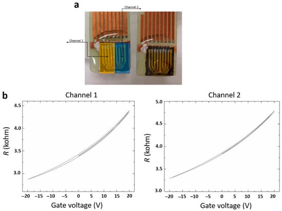 Representative (a) image of operational sensor chip and (b) resistance (R) vs. gate voltage (V) characteristics of the biosensor, for both channels of the device.