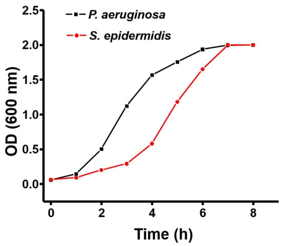 The growth pattern of P. aeruginosa and S. epidermidis. P. aeruginosa was grown in a sterile tube containing LB broth and S. epidermidis grown in a sterile tube containing TSB broth. The optical density of culture was measured for 8 h with the interval of 1 h.