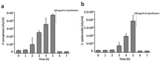 The number of P. aeruginosa and S. epidermidis cells with respect to growth time is presented in Figure 4a,b, respectively, in terms of colony forming unites. As shown in Figure 4, no significant increase in the number of bacterial cells was detected until 3 h of growth. This is compatible with the result obtained from the growth-pattern analysis (Figure 3) where a lag phase of bacterial growth was observed. Significant growth of bacterial cells was observed from 3 h of growth for both strains. The addition of ciprofloxacin after 5 h of growth reduced the number of viable bacteria to zero.