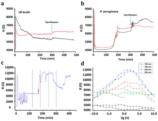 The resistance-versus-time plots for LB medium (a) and P. aeruginosa (b) without gate voltage (Vg). Resistance -versus-time plot for P. aeruginosa in the presence of Vg (c). Resistance-versus-Vg plot at different time points (d) indicated in (c) by the vertical dashed lines color matched with R(Vg)-curves in (d).