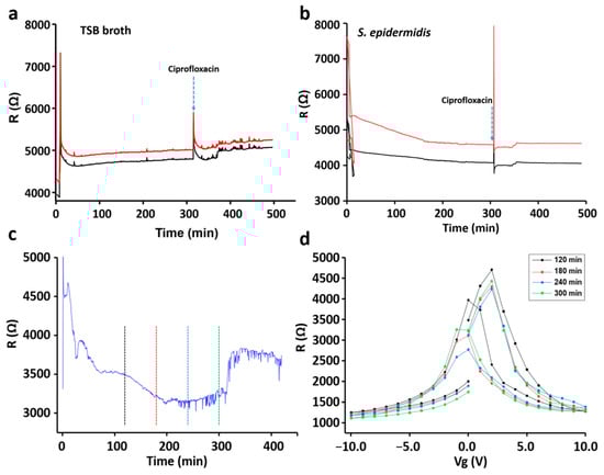 The resistance-versus-time plots for TSB medium (a) and S. epidermidis (b) without gate voltage (Vg). Resistance-versus-time plot for S. epidermidis in the presence of Vg (c). R(Vg) plots at different time points (d) indicated in (c) by the vertical dashed lines color matched with R(Vg)-curves in (d).