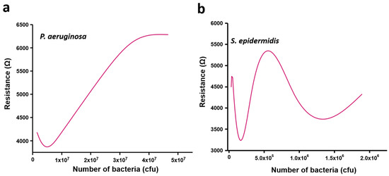 This again correlated with the slower growth of S. epidermidis compared to P. aeruginosa (Figure 3). The number of S. epidermidis cells increased from 6.0 × 104 to 9.0 × 105 between 2 and 4 h of growth (Figure 4b). As shown in Figure 7, the resistance versus CFU plot shows the increase of resistance with the number of CFUs. The increase in resistance with P. aeruginosa was linear in the range of ~0.5 × 106 to 3 × 107 CFUs, followed by a sharp saturation (Figure 7a). By contrast, the resistance-vs-CFU profile for S. epidermidis was more complex, with a local minimum at 2 × 105 and a maximum between 6–7 × 105 CFUs (Figure 7b). Some bacterial strains produce acids during their growth, which can influence the resistance pattern. The pH of the bacterial culture after 5 h of growth is presented in Table 1. For both tested bacterial strains, the pH after 5 h of bacterial growth was found to be similar to the initial pH. This suggests that the observed pattern is not due to the pH changes in the culture but is solely due to the adhesion of bacteria to the sensor surface, according to their distinct growth dynamics and changes in the environment.