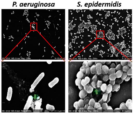 SEM images of P. aeruginosa and S. epidermidis biofilms after 5 h of growth on the sensor chip. The lower panel shows bacterial cells at a higher magnification. The green arrows depict the exopolymeric substances.