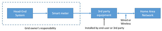 The Premise Area Network divides into three sections depending on the environment, HAN (Home Area Network), Building Area Network (BAN), and IAN (Industrial Area Network). These are wired or wireless networks within the end-user’s premise. The purpose of the HAN is to provide communication between for example the smart meter and home automation, appliances, Home Energy Management Systems (HEMS), solar panels, or electric vehicles. BAN and IAN are commercial and industrial focused and communicate typically with building automation systems such as heating and ventilation or energy management systems. These applications do not require large coverage, high speed, or high data rate, and can be managed with low power, low-cost technologies such as Power Line Communication (PLC), Wi-Fi, or ZigBee [57]. The required bandwidth in HANs vary from 10 to 100 kbps for each device, depending on function. The premise networks should be expandable to allow for the number of connected devices to increase [59]. Other applications for the smart metering devices within the premise area are delivering information such as power and real-time price information to the end-user through HEMS. The end-user can then make decisions whether to use appliances during high price periods or wait for lower price. This can in turn help with peak demand reduction and load shifting [60].