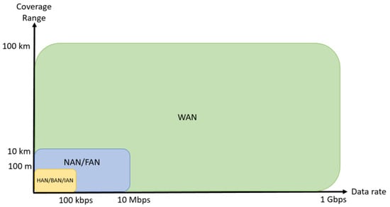 A defined communications framework is necessary in this infrastructure. It is crucial to have clearly defined standards to ensure reliable, efficient and secure communication throughout the system [54]. The different network types in the communications layer mentioned above have all different requirements when it comes to data rate and coverage distance, and the chosen communication technology must support these specific requirements, which are summarized in Figure 3 and Table 5. The networks utilize different technologies for communication, both wireless and wired. The premise network (HAN, NAN, or IAN) is closest to the end-user, and enables information and communication flow between home appliances or for example heating, ventilation, and air conditioning (HVAC) systems within the end-user premise. Multiple HANs connects to a NAN. The NAN collects information, and enables communication to the WAN. An illustration of different networks in an SG are depicted in Figure 4. The WAN handles communication of metering information from the end-user to the utilities companies [55].