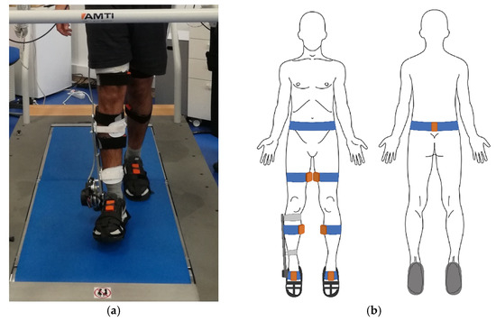 Representation of the (a) experimental setup with the participant walking on the instrumented treadmill while wearing the inertial motion capture system in the lower limbs, along with the foot ankle orthosis in the right lower limb and (b) inertial sensor placement locations in the participant’s lower limbs.
