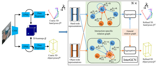 Graph convolutional networks (GCNs) are introduced to capture inherent dependencies between nodes of graph-structured data. In general, the principle of constructing GCN follows two mainstreams: spectral perspective [25,26] and spatial perspective [27,28,29]. Spectral GCNs use the spectral representations of graphs to perform graph convolution operations. Cai et al. [20] adopt a spectral GCN to handle graphs with predefined and fixed topology for 3D pose estimation, which nevertheless lacks the flexibility and capacity to model latent relations among nodes. In comparison, spatial GCNs directly perform convolution filters on graph vertexes and their neighbors and usually can handle topology-varied graphs. For hand–object pose estimation, Doosti et al. [19] utilize an adaptive GCN to model subtle relationships between joints by constructing a parameterized relation graph. However, this approach tries to learn a general graph for different HOI scenarios, which may be suboptimal for all the samples due to the complexity and variability of HOI in real-world applications. Instead, we propose InterGCN that takes advantages of not only prior knowledge of general hand–object relations, but also interaction-specific relations automatically learned from representations of hand joints and objects corners.