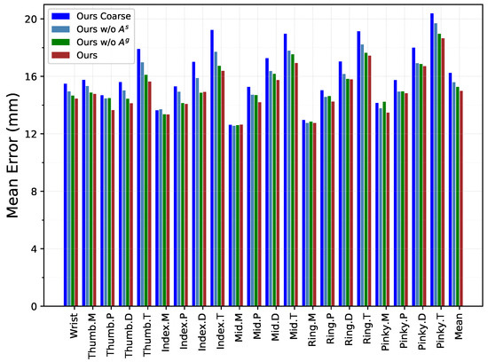 As introduced in the method section, there are two types of graphs representing hand–object relations in each layer of InterGCN, i.e., general relation graph and interaction-specific relation graph . To examine the effect of using different relation graphs for hand–object pose estimation, two sets of experiments are conducted. As presented in Table 3, the results show that the two relation graphs are both beneficial for hand–object pose estimation and that deleting any one of the two graphs will degrade the performance. It is also worth noting that removing interaction-specific relation graph leads to a significantly greater decline in performance, demonstrating that modeling unique relations for each HOI scenario plays a crucial role in hand–object pose estimation. With all relation graphs added together, the model achieves the best performance. In addition, Figure 5 breaks out the distance error of each hand joint, which is in line with the above results and further illustrates the effectiveness of relation graphs.