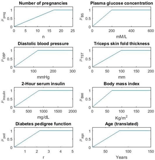 This section presents a detailed analysis of the proposed fuzzy model for diabetes prediction. The proposed model has been evaluated using a diabetes dataset taken from an online database, Kaggle, and implemented on MATLAB R2021a (version 10.0). 52% of data has been used for training and 48% has been of data is used for testing. At first, the dataset has been normalized, which means that each numerical value in the dataset is between 0 and 1. The equation for normalization is given in Equation (1). Fuzzy membership values for the variables considered in this study are shown in Figure 2, versus the respective universes of discourse.
