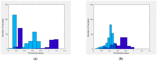 Demonstrates the threshold values of both classifiers for the training phase. (a) shows the threshold values for classifier 1 and (b) shows the threshold values for classifier 2.