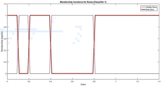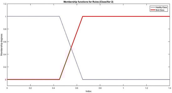 With the information perceived from Figure 3b, we find a threshold 0.5. Based on this threshold value, we setup MFs namely for sickness status respectively. MFs for classifier 1 are shown in Figure 5.