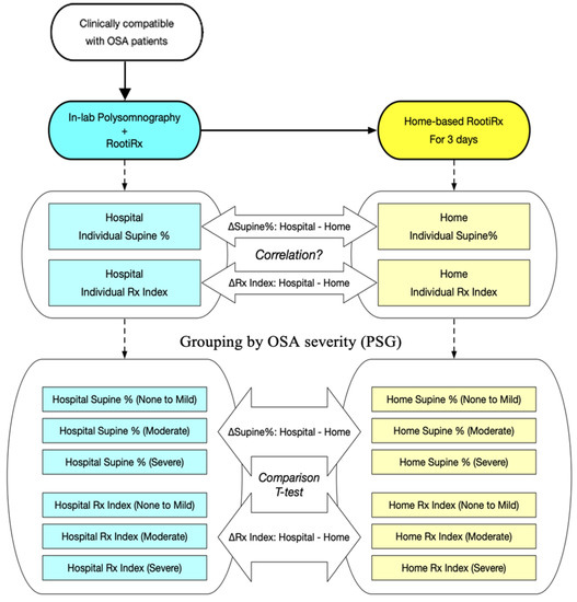 All statistical analyses, the framework of which is presented in Figure 1, were conducted using SPSS software (IBM SPSS Inc., Chicago, IL, USA). First, we conducted the Shapiro–Wilk test to examine the normality of the continuous variables. The baseline characteristics of the patients in the OSA groups were compared, using one-way analysis of variance (normally distributed data) or the Kruskal–Wallis test (nonnormally distributed data) for the continuous variables and the chi-squared test for the categorical variables. Subsequently, we performed Student’s t-test (normally distributed data) or the Mann–Whitney U test (nonnormally distributed data) to compare the sleep parameters and positions obtained at the sleep centres and at home. The correlations between the variations in the percentage of sleep time spent in a supine position (∆Supine%), and CVHRI (∆CVHRI), CEI (∆CEI), and Rx index (∆Rx index) were investigated through the Spearman rank correlation test. All tests were two-tailed, and differences were considered significant at p < 0.05.