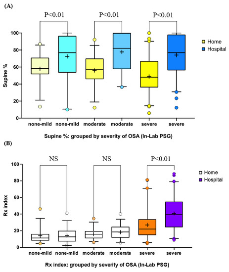 Comparison of the variation in the percentage of supine sleep time and Rx index values obtained in hospital and home settings: (A) percentage of supine sleep time in the various OSA severity groups; (B) Rx index in the various OSA severity groups. Abbreviations: Rx index, combination of the cyclic variation of heart rate index and the chest effort index; OSA, obstructive sleep apnea; PSG, polysomnography; ns, nonsignificant.