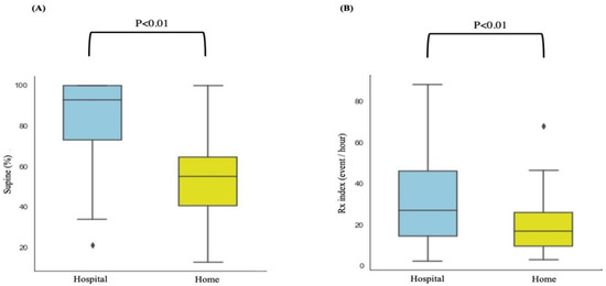 Variation of the percentage of supine sleep time and the Rx Index values determined in hospital and home settings in the high-sleep-efficiency group (≥90%; n = 46): (A) variation in the percentage of supine sleep in various sleep environments; (B) variation in Rx index values in various sleep environments. Abbreviations: Rx index, combination of the cyclic variation of heart rate index and the chest effort index.