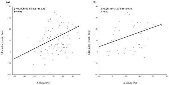 Figure 5 presents the correlation between the ∆Supine% and ∆Rx index in patients with high sleep efficiency. In patients with a sleep efficiency of ≥80%, the ∆Rx index was significantly and moderately correlated with ∆Supine% (ρ = 0.35, 95% CI: 0.17 to 0.51, p < 0.01). In patients with a sleep efficiency of ≥90%, the correlation was weaker but still significant (ρ = 0.29, 95% CI: 0.05 to 0.50, p < 0.01). Collectively, given that environmental factors can affect OSA severity, patients with high sleep efficiency still exhibited weak-to-moderate relationships between the supine sleep time and OSA indices. These outcomes suggest that the hospital-based OSA indices were overestimated because of the high percentage of sleep time spent in the supine position.
