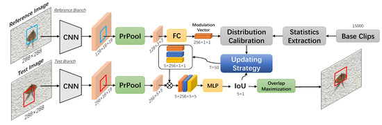 An overview of DCOM is shown in Figure 2. The reference branch receives the reference image and the bounding box of the target object as the inputs, and it outputs a modulation vector as the initial reference information. The distribution calibration module receives the statistics from the base clips and the original modulation vector as inputs, followed by an updating module. The updating strategy generates the final modulation vectors according to the IoU and the calibrated distribution of the reference information. The new modulation vectors are then employed in the test branch to predict the overlap between the candidate box and the groundtruth. The overlap maximization module is used to refine the final bounding box.