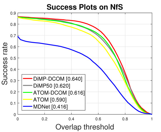 We evaluate our approaches on the 30 FPS version of NfS dataset [23], which consists of 100 challenging videos. AUC scores are shown in Table 6 and the success plots are shown in Figure 4. It can be seen that ATOM-DCOM and DiMP-DCOM achieve AUC scores of 0.616 and 0.640, respectively, outperforming ATOM and DiMP by 2.6% and 2.0%, respectively.