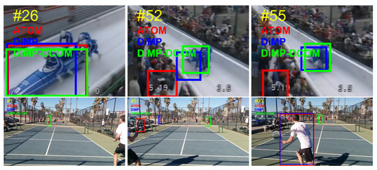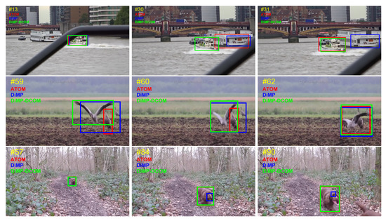Visualization tracking results of DiMP-DCOM (green), DiMP (blue), and ATOM (red) on the challenging sequences from GOT-10k [21]. We can see that DiMP-DCOM shows stronger ability