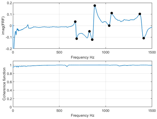 where is the averaged auto-spectrum of the response. For the coherence function, more than one average is necessary. The coherence function has values less than or equal to 1, with a value of one indicating an ideal measurement process. In this study, an average of ten measurements were calculated at each measurement point. Figure 1 shows the imaginary part of the FRF as well as the coherence function for a point at the central upper part of the ellipse. The peaks in , shown as black circles in the figure, indicate the natural frequencies of the structure. These frequencies were obtained for each measurement point in the structure, and the experimental mode shapes were calculated using the quadrature picking method [24]. It can be seen in the figure that the value of the coherence function is close to one at all frequencies, indicating that individual measurements are very consistent with each other. It should be pointed out that obtaining a consistently high coherence function is not trivial, particularly if a manual excitation (typically with an impact hammer) is used, since a very steady hand of the experimenter is required. A common alternative is the use of a shaker, providing the added benefit of an excitation with a programmable frequency spectrum. However, the use of a shaker requires a fixed coupling between the shaker and the structure under study, which provides a path for background noise and may also restrict the response of the structure. To improve upon the problems described, an automated impulse excitation was implemented in the present work, where the excitation tip, equipped with a force sensor, was programmed to periodically hit the structure under study by means of an actuator.