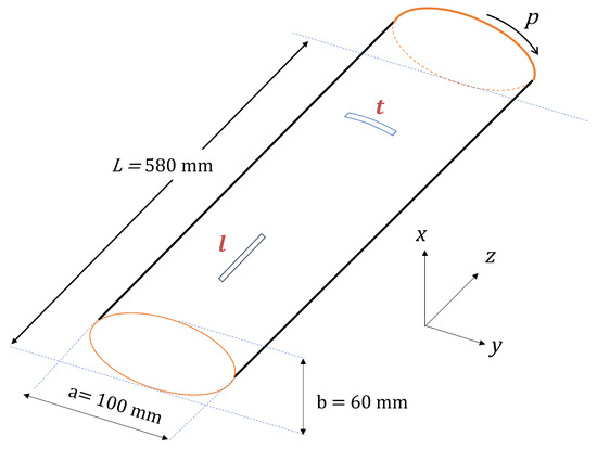 A thin-walled hollow elliptical cylinder was used as the sample both in the numerical simulations as well as in the experimental validation; its geometry is shown in Figure 2. The cylinder dimensions are: a major axis of 100 mm, a minor axis of 60 mm, and a length (in the z or longitudinal direction) of 585 mm. The walls of the cylinder have composite layered configurations of and of unidirectional laminate (UDL), with each layer having a thickness of 2 mm. The material properties employed in the FE analysis are given in Table 2; these properties are consistent with those used in the physical prototypes.
