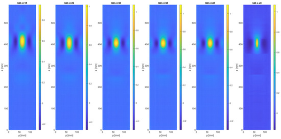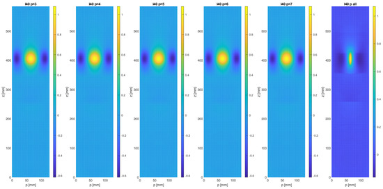 In Figure 3, the effect of reducing the mesh resolution in the z-direction is shown for the case of the native resolution in the circumferential direction (p). The number of grid points chosen in the z-direction were 15, 22, 30, 38, and 45. The number of points in the p-direction was = 5 in all cases, with the exception of the image with the native resolution (far right). These numbers have to be compared to the native resolution of the FE model, based on 13,272 nodes, with an approximate number of points in the z-direction of 237 and a number of 56 points in the p-direction.