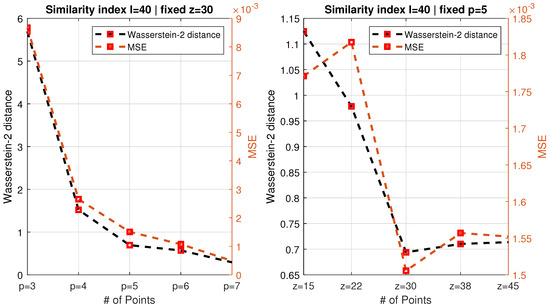 Evolution of the similarity metrics (FID or Wasserstein-2 distance, as well as MSE) as function of the number of measurement points in the axial (z) direction for a fixed number of circumferential measurement locations (left) and for a variable number of points in the p-direction, for a fixed number in z (right). In all cases, the crack was longitudinal (pointing in the z-direction), with a length of 40 mm.
