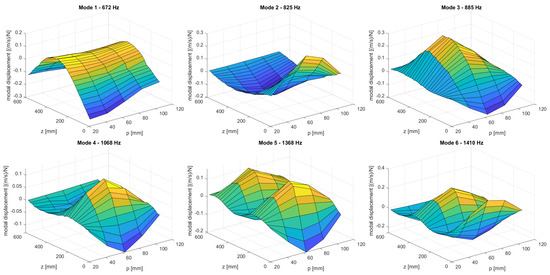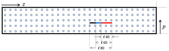 Based on the findings of Section 3, a 5 × 30 grid was used in the p-z plane (see Figure 6). At each point of the re-sampled mesh, the modal displacement along the x coordinate (see Figure 2) was extracted from the numerical model. The fault analyzed is located between the third and fourth point of the p-axis in the upper part of the structure and has a width of 2 mm, a depth of 4 mm, and comes with three different lengths, ℓ40 = 40 mm, ℓ60 = 60 mm, and ℓ80 = 80 mm. The fault locations in the p-z plane are given in Table 3.