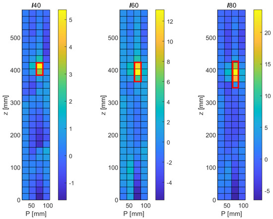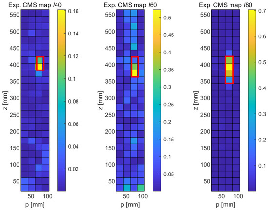 Experimental results obtained with the detection of longitudinal cracks with the CMS method. Left: 40 mm crack, Middle: 60 mm crack, Right: 80 mm crack.