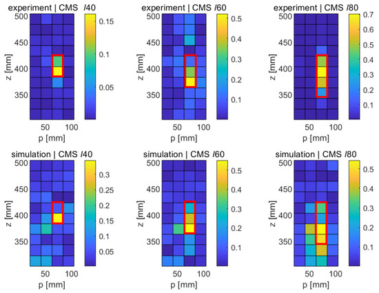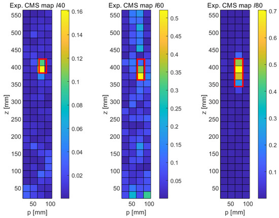 As explained in Section 2.1, the MSD requires the knowledge of the mode shapes of the undamaged structure, which may not always be available. The CMS method provides an alternative for those cases. Figure 8 shows the results obtained with this method in the numerical case; as before, the results shown are for the upper part of the elliptical cylinder and are displayed in the p-z plane. It can be seen that the crack-type damage features show up as bright regions in the CMS maps in a similar way to their appearance in the MSD maps, albeit at a higher noise level. In the case of the shortest crack (ℓ40), the fault clearly stands out in its CMS signal, but a relatively large distributed disturbance also occurs in the lower part of the structure. In the cases of the longer cracks (ℓ60 and ℓ80), significant CMS signals are limited to the damage areas, as expected, but the signal is not quite as clean as in the case of the MSD method. This somewhat poorer performance of the CMS method was, of course, expected, given its lack of a baseline case; however, the fact that the faults are still clearly detectable in the CMS maps is quite encouraging.
