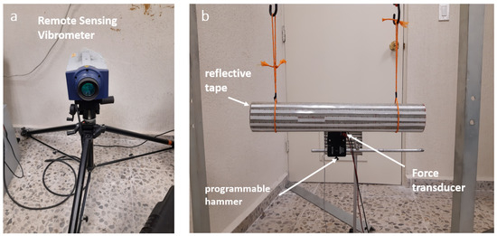 The experiments were performed on a composite elliptical cylinder with the dimensions and material properties given in Section 4.1. The cylinder was excited in the middle of the lower face employing a programmable actuated metallic pin connected to a PA253 power amplifier. A Brüel & Kjær 8230 force transducer was attached to the end of the exciter. Vibration measurements were taken at a distance of 5 meters with the RSV-150 Remote Sensing Vibrometer from Polytec (Figure 10a). For the signal acquisition, a dynamic signal analyzer PHOTON + and the RT Pro Photon software were used; the sampling frequency was 4000 Hz. The annotated photographs in Figure 10 show the setup described. By design, laser vibrometers detect the the modal displacement along the laser beam direction. To a good approximation, this direction corresponds to the x-coordinate in Figure 2 at all measurement locations, given the large distance between the sample and the vibrometer, and the correspondingly small angle subtended by the horizontally suspended beam (≈ m/5 m ). Measurements were taken individually at the 30 × 5 measurement locations determined as optimal in Section 3 by slightly adjusting the angle of the vibrometer. Reflective tape was placed at all locations to ensure a strong signal at the vibrometer. The quadrature picking method [24] was used to construct the mode shapes.