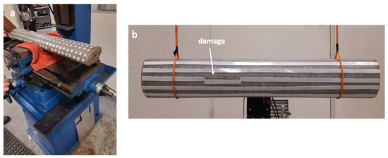 The damages analyzed in the experiment have the characteristics and locations presented in Table 2 and Table 3. These damages were carried out sequentially in the same structure, starting with the 40 mm one (Figure 11b). After taking the corresponding measurements, the length of the damage was increased to 60 mm and, finally, to 80 mm. The damage feature was created by milling the structure (Figure 11a).