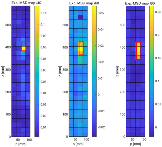 Figure 13 shows the experimental results obtained with the MSD method for the three crack-type damage features , and sizes. These results are surprisingly clean results and rival the quality of the numerical results. We first note that the general noise level is very low and fairly uniform. As opposed to the numerical results, no long-range effects are observed, i.e., the changes in modal response are very localized. Furthermore, the MSD metric is practically positive throughout (with the exception of one outlier in the upper part of the central graph of Figure 13). As before, the nominal locations of the cracks have been indicated with red rectangular frames superimposed on the damage maps. It can be seen that a clear signal emerges at the expected locations in all three cases, and the length of the crack is correctly predicted, with the exception of the shortest fault , where the implied length is only half of the true length. It can therefore be stated that the MSD correctly detects all three cracks and reproduces the correct crack length in the case of the two longer cracks ( and ).