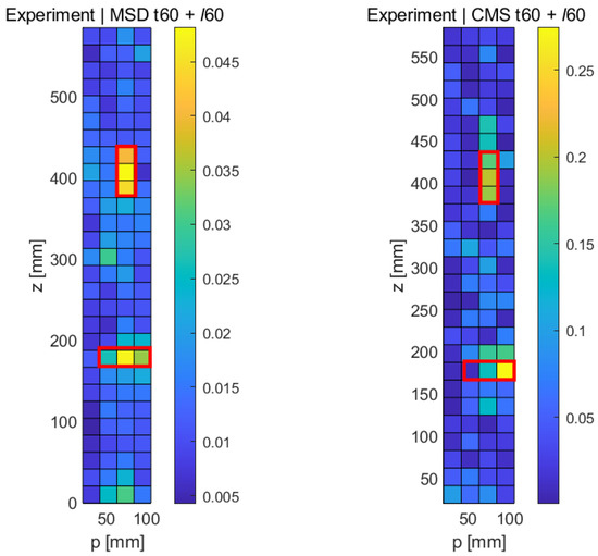 The experimental results for the two-fault sample using the MSD method are shown in the left part of Figure 16, with the expected location of the longitudinal fault being shown in the red box and the transverse fault in the white box. It can be seen that the longitudinal crack (ℓ60 stands out clearly (yellow/orange colors), whereas the transverse crack in the lower part of the damage map shows a somewhat lower response, while still producing a recognizable damage signal of approximately the correct length. As before, the CMS damage map has a somewhat higher general noise level, but both faults can be detected reliably. The longitudinal crack produces a somewhat lower signal compared to the MSD case, but the crack length can be estimated correctly. The lower (transverse) crack is also detected, but its length is underestimated.