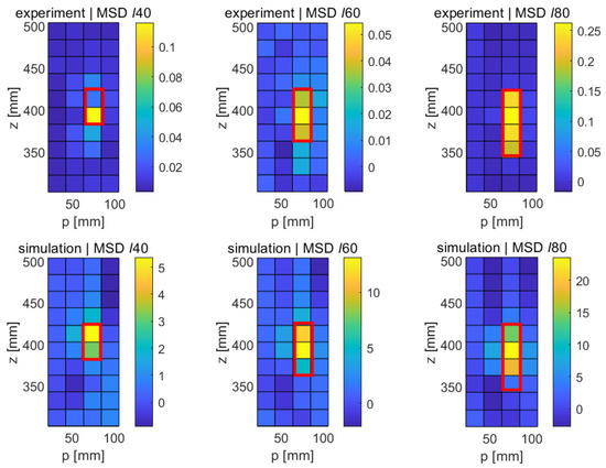 Figure 7 shows the numerical results for the different longitudinal faults (ℓ40, ℓ60, and ℓ80) obtained with the MSD method in the p-z plane. Regions with the highest differences in modal displacements between the original and the damaged structure are shown in yellowish colors; regions with little changes appear in bluish colors. The red frames superimposed on the subfigures indicate the expected size and location of each of the faults. Referring to Table 3, it can be verified that the locations of the fault fall into the ranges of the down-sampled cells in the figure. The circumferential position of all three longitudinal faults is at 73 mm, which falls into the range of the third circumferential class between 50 mm and 75 mm shown in the graph. Similarly, the crack can be seen to extend down from 420 mm in all three cases, extending to 380 mm, 360 mm, and 340 mm. It can be verified that the modal displacement difference in these ranges is particularly pronounced in each of the cases. It can therefore be concluded that the locations of the three faults ℓ40, ℓ60, and ℓ80 are correctly detected, at least under the idealized conditions of a numerical study with vanishing noise level. It should be noted that some changes in the modal displacement also occur far away from the fault, e.g., towards the lower end of the structure. However, these changes are relatively small and show the opposite sign of the change occurring at the fault. Given that modal responses are a collective phenomenon by definition, a certain global effect of a local disturbance is, of course, to be expected. However, it is clear from the the figure that this effect is minor, and that the modification of the modal pattern is mostly confined to the area of the fault.