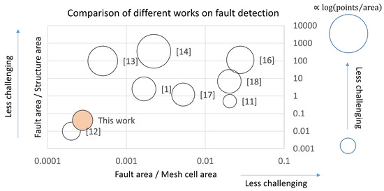 Though the present work is, to the best knowledge of the authors, the first demonstration of damage detection in CTWB structures, which singles out the present research from other recent work such as the one reported in Table 1, which is mostly on plates and simple materials, it is still useful to conduct some basic benchmarking to place the contributions of the present work in an appropriate context. To do so, we have calculated three basic metrics for each work on two-dimensional structures (mainly plates, with the exception of the present work, where the modal displacement on the curve upper shell of a CWTB structure has been analyzed): , where is the fault area and is the full surface area of the test structure; , where is the area of the unit cell of the measurement mesh; and , where N is the number of points contained in the measurement mesh. The larger and are, the less challenging it is to detect a fault. Similarly, the larger is, the easier it should be to detect changes in the modal patterns (see Figure 19).