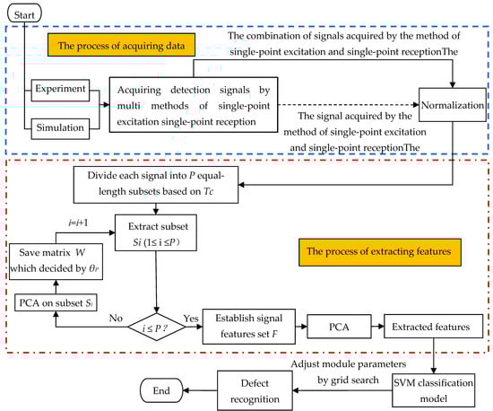 This paper proposes a new method for identifying rail defects to get away from the limitation of professional knowledge and experience. It can distinguish the defects by combining multiple signals and extracting the features by the S-PCA. The process of identifying rail weaknesses is shown in Figure 1. First, guided wave detection signals are obtained through experiments and simulations of several single-excitation and single-reception methods, as shown in the area enclosed by the round dash line. Then, the S-PCA is used to extract features from the obtained signals, as shown in the area enclosed by the round dotted line. Finally, the SVM classification model enables one to qualitatively and quantitatively identify rail defects based on the extracted features. In signal processing, the restriction of professional knowledge is avoided by dividing the guided wave detection signal and extracting features from each segment. Compared with PCA, S-PCA can dig more weak damage information from guided wave detection signals, which is more conducive to defect identification.