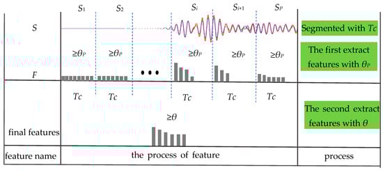 Figure 3 is a schematic diagram of the S-PCA. There are two steps based on the S-PCA to extract features. The first step is to divide. According to the time interval Tc, the detection signal S is divided into P segments of equal length. Si represents the ith signal segment (1 ≤ i ≤ P). The second step is feature extraction in two sub-steps. The first sub-step is extracting features from each segment by PCA with a threshold θP (0 < θP < 1) to form a feature set named F. The second sub-step is to get the final features from F by PCA with a threshold θ (0 < θ < 1).