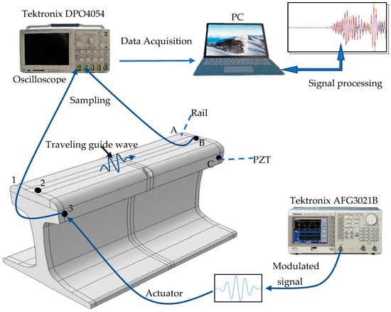 The experimental system is shown in Figure 4. The experimental object is a 60 kg/m rail with a length of 250 mm. Ceramic piezoelectric sheets (PZT-5H, diameter 14 mm, thickness 1 mm, center frequency 200 kHz) are arranged symmetrically on the railhead and marked in sequence as 1, 2, 3, A, B, C. The distance between the center of the piezoelectric films and the rail end is 7 mm. The vertical distance between the rail tread and the center of the piezoelectric films 1, 3, A, or C is 23.57 mm. The piezoelectric plates at positions 1, 2, and 3 are used to excite guided wave signals, and the piezoelectric plates at positions A, B, and C are used to receive detection signals. Any exciting sensors are paired with any receiving sensors to form a signal acquisition channel. There are 9 channels for acquiring signals, like 1TA, 1TB, 1TC, 2TA, 2TB, 2TC, 3TA, 3TB, 3TC. Figure 5 is a connection diagram of the detection equipment. The arbitrary function generator (TektronixAFG3021B) can modulate a sinusoid exciting signal of 200 kHz and 5 circles loaded alternately on piezoelectric slices 1, 2, or 3. The guided wave signal will propagate in the rail. The detection signals are collected using piezoelectric slices A, B, or C. Both the excitation signal and the reception signal are input into the oscilloscope (Tektronix DPO4054) with a specific sampling frequency.