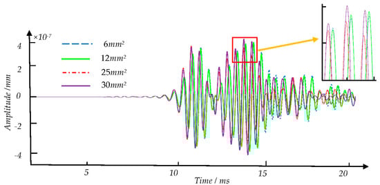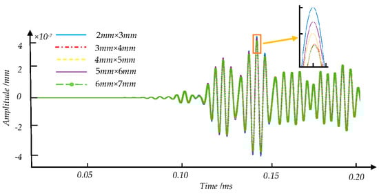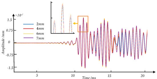 Figure 8 shows the waveform diagram of the crack detection signal obtained at the time range of 0–0.002 s by 2TA in the experiment, and the cracks’ depth is 2 mm, 4 mm, 6 mm, 7 mm, respectively. Based on the guided wave theory, the guided wave group velocity is about 3845 m/s in the experiment. And the speed in the simulation is 3850 m/s, approximately like the result of the experiment. In addition, the experimental signal waveform is like the simulated signal waveform, under different degrees of defect damage. Thus, the simulated signals are used for the expansion of defect samples.