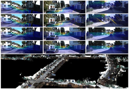The calibration results in Table 6 illustrate that the CFNet can obtain accurate calibration results given initial parameters. The calibration errors for sequences 00 and 08 are a bit lower than those of the other three sequences. This is because most of the scenes in the training dataset belonged to the urban category, leading to a slight performance reduction in different scenes. By changing the length of sequences, we acquired a group of calibration results for analysis. In most cases, the mean translation error decreased when the length increased, and the mean rotation error had a small range of fluctuation. Although the sequence length influences the calibration results, the differences between different length settings are negligible. Therefore, a short sequence length, e.g., 10, is enough for a practical application. Figure 7a shows visualized results from the predicted extrinsic calibration parameters in different scenes. Due to the initial values from assembly positions of sensors being close to the ground truth, the initial calibration error is small. However, CFNet still estimated the best extrinsic parameters and found correct correspondences between RGB pixels and LiDAR points. With the extrinsic calibration parameters estimated by the proposed CFNet, we constructed 3D colorized maps by fusing RGB images and exhibit them in Figure 8a.