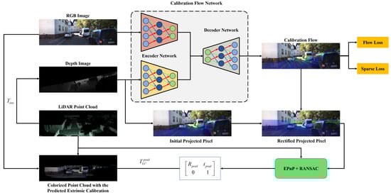 We first define a calibration flow, which represents the deviation between the positions of initial projected points and the ground truth, for automatic online LiDAR-camera self-calibration in this paper. The presented CFNet predicts a calibration flow instead of regressing extrinsic parameters. The predicted calibration flow is utilized to rectify the initial projected points for the construction of accurate 2D–3D correspondences. Then the EPnP algorithm [16] is used to calculate the final extrinsic parameters within the RANSAC scheme [17]. CFNet does not need additional specific calibration scenes, calibration targets, or initial calibration parameters, and is fully automatic. A similar idea was proposed in CMRNet++ [18], which is for monocular visual localization in LiDAR maps.An example of the utilization of CFNet is shown in Figure 1. More specifically, we showcase the contribution of CFNet as follows: