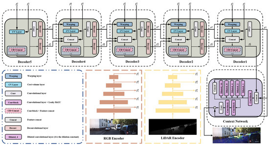 There are two feature extraction networks based on a modified ResNet-18 [46] in the encoder: one is for RGB images (RGB encoder), and the other is for depth images projected from LiDAR point clouds (LiDAR encoder). We replaced the ReLU in both branches with Leaky ReLU. Since the inputs of the two branches are heterogeneous images, the weights are not shared between them. Since the projected depth image has only one channel, the number of input channels in the first convolution layer of the LiDAR encoder is 1. Besides that, the other parts of the feature extraction networks, such as the number of features per layer and stride, are consistent with the original ResNet-18. We do not apply the pre-trained models of ResNet-18 during training.